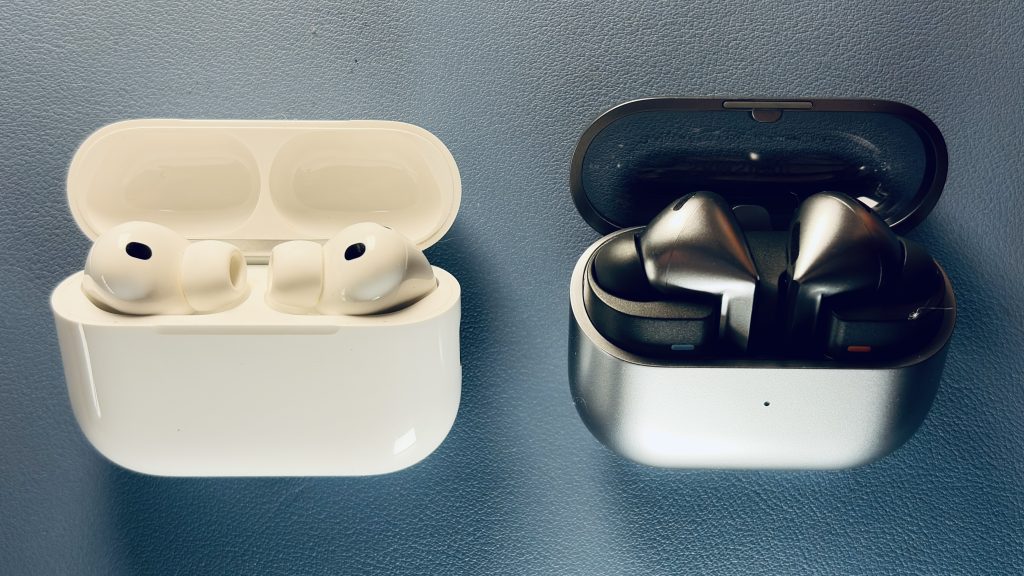 AirPods Pro 3 (à esquerda) ao lado do Galaxy Buds3 Pro