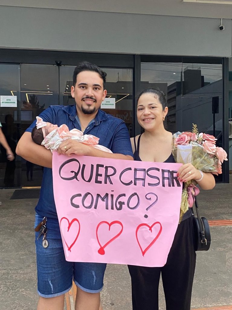 “Desde quando nos juntamos ela sempre falava que queria casar. Mas sempre relevamos por motivos financeiros e outros motivos. E com o passar do tempo ela engravidou, e pensei algumas vezes em pedir ela em casamento, mas esperei. E assim que ela ganhou, foi a primeira coisa que vejo a minha cabeça. Quando ela me mandou mensagem dizendo que estava de alta não pensei duas vezes em organizar cartaz, flores e alianças para pedir ela em casamento ali mesmo na maternidade”, explicou o noivo.