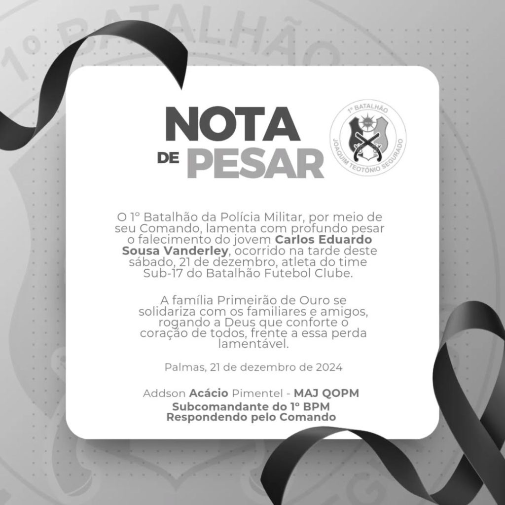 O acidente aconteceu no fim da tarde deste sábado (21). Carlos Eduardo era jogador do Batalhão Futebol Clube, time sub-17 da Polícia Militar do Tocantins.