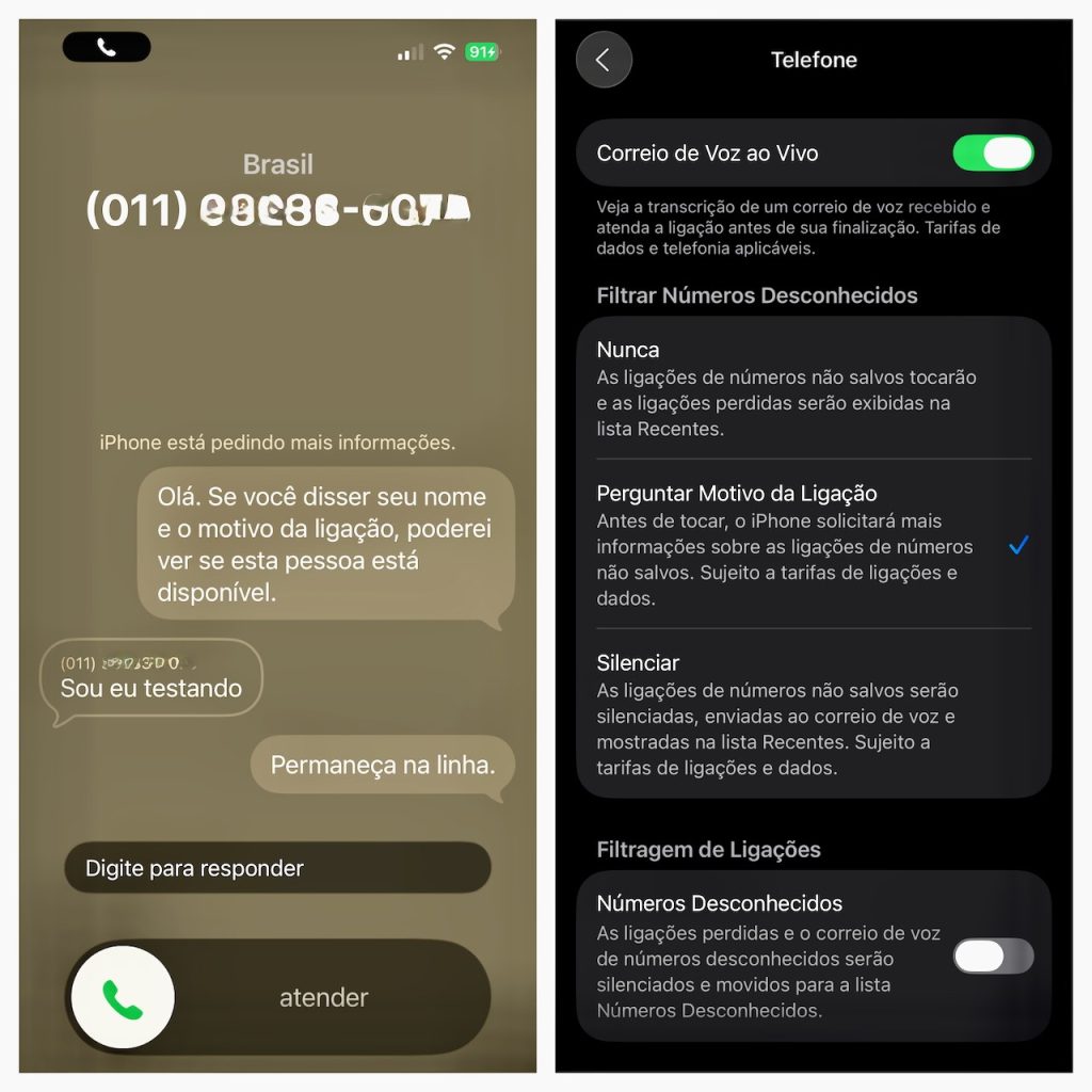 Tela do iPhone 17 (esq.) atendendo a uma ligação de número desconhecido e borrado por privacidade. À direita, a tela de configurações do iOS
