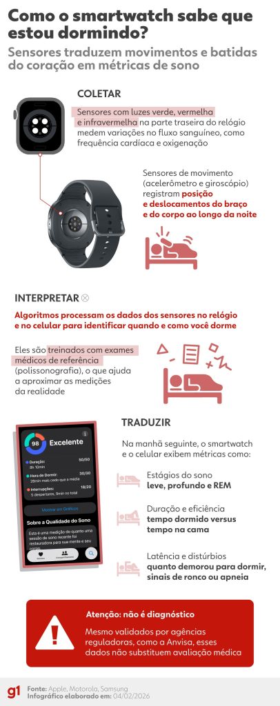Com sensores ópticos e rastreadores de movimento, o smartwatch consegue avaliar como foi a sua noite de sono, com resultados comparáveis aos de estudos médicos. Veja no infográfico a seguir.