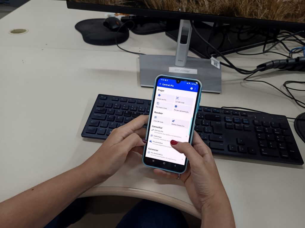 Pessoa segurando celular na área Pix de aplicativo bancário