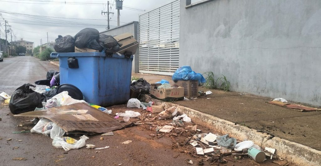 Coleta do lixo domésticos está suspensa devido a atrasos de pagamento aos funcionários, segundo a Empresa MB Limpeza Urbana. Prefeitura afirma que está tratando com a empresa e espera que o impasse seja resolvido. Contêineres de lixo transbordando em frente ao estacionamento do HGP, em Palmas