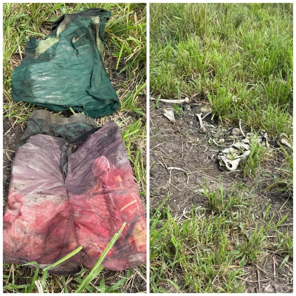 Pelas imagens publicadas em redes sociais, é possível ver os restos mortais próximos a uma bermuda e uma camiseta, possivelmente da vítima.