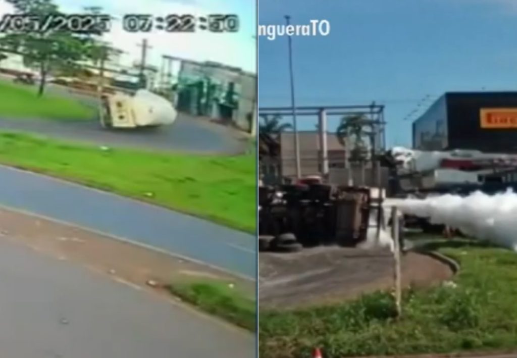 Um caminhão-tanque carregado com oxigênio tombou, na manhã desta segunda-feira (13), após entrar em uma rotatória na BR-153 em Araguaína, no norte do Tocantins. Após o acidente, o gás foi liberado e o trânsito ficou parcialmente prejudicado. Ninguém se feriu.