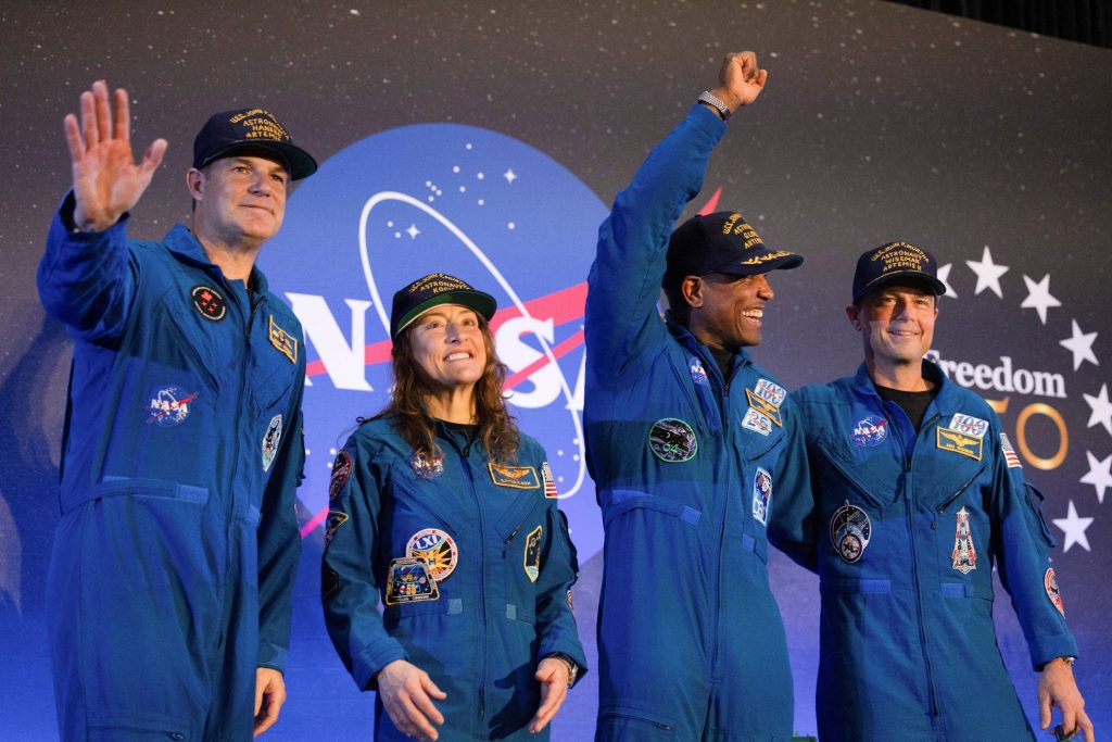 A tripulação da missão Artemis II, composta posa no palco um dia após o pouso no Oceano Pacífico, na Base Aérea Conjunta de Ellington Field, em Houston, Texas, EUA, em 11 de abril de 2026